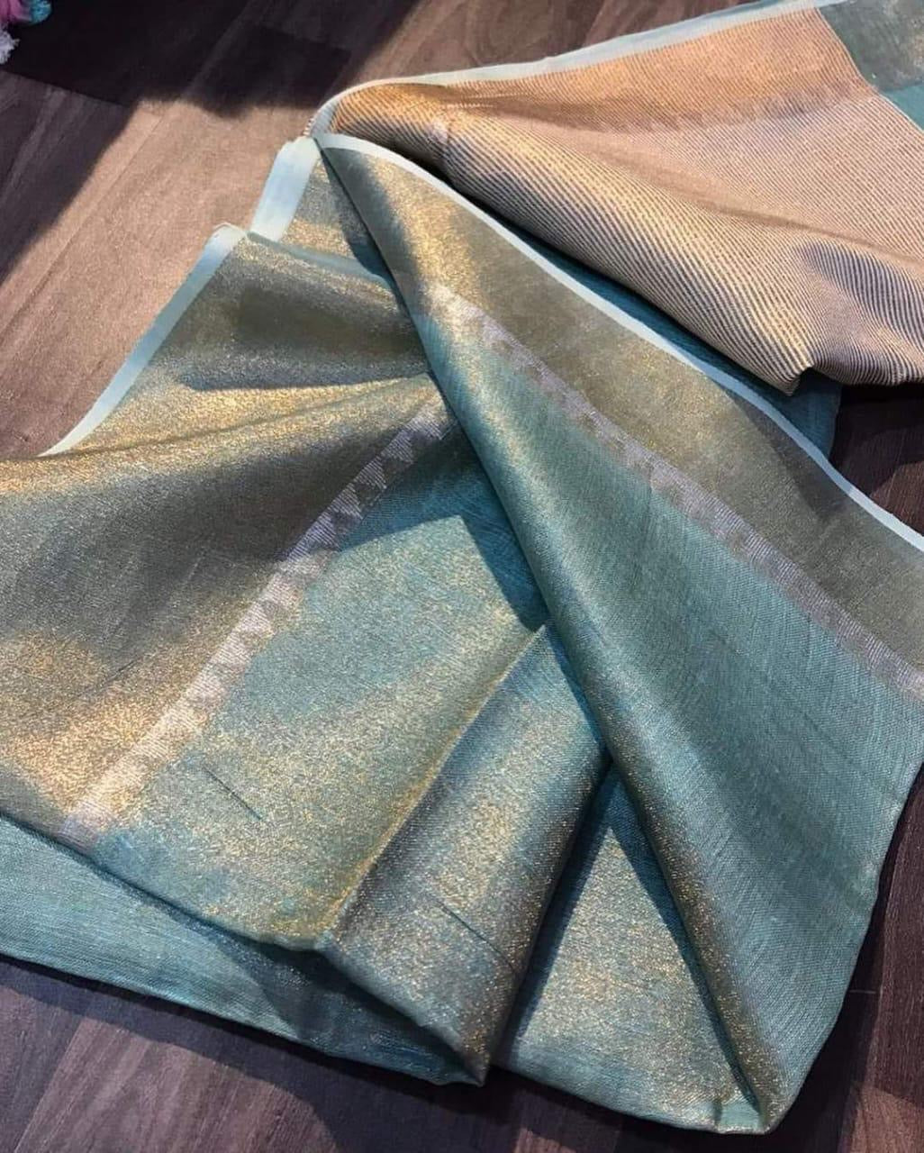 Plain pure tissue linen handloom silk saree with beautiful subtle gold border at the end with gold tissue Pallu. Has a running blouse attached with the saree.