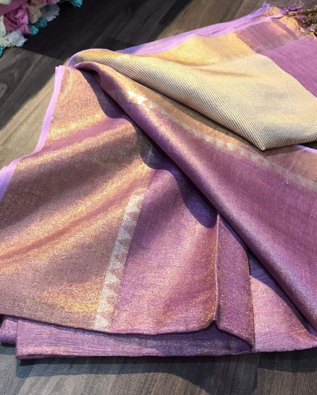 Plain pure tissue linen handloom silk saree with beautiful subtle gold border at the end with gold tissue Pallu. Has a running blouse attached with the saree.