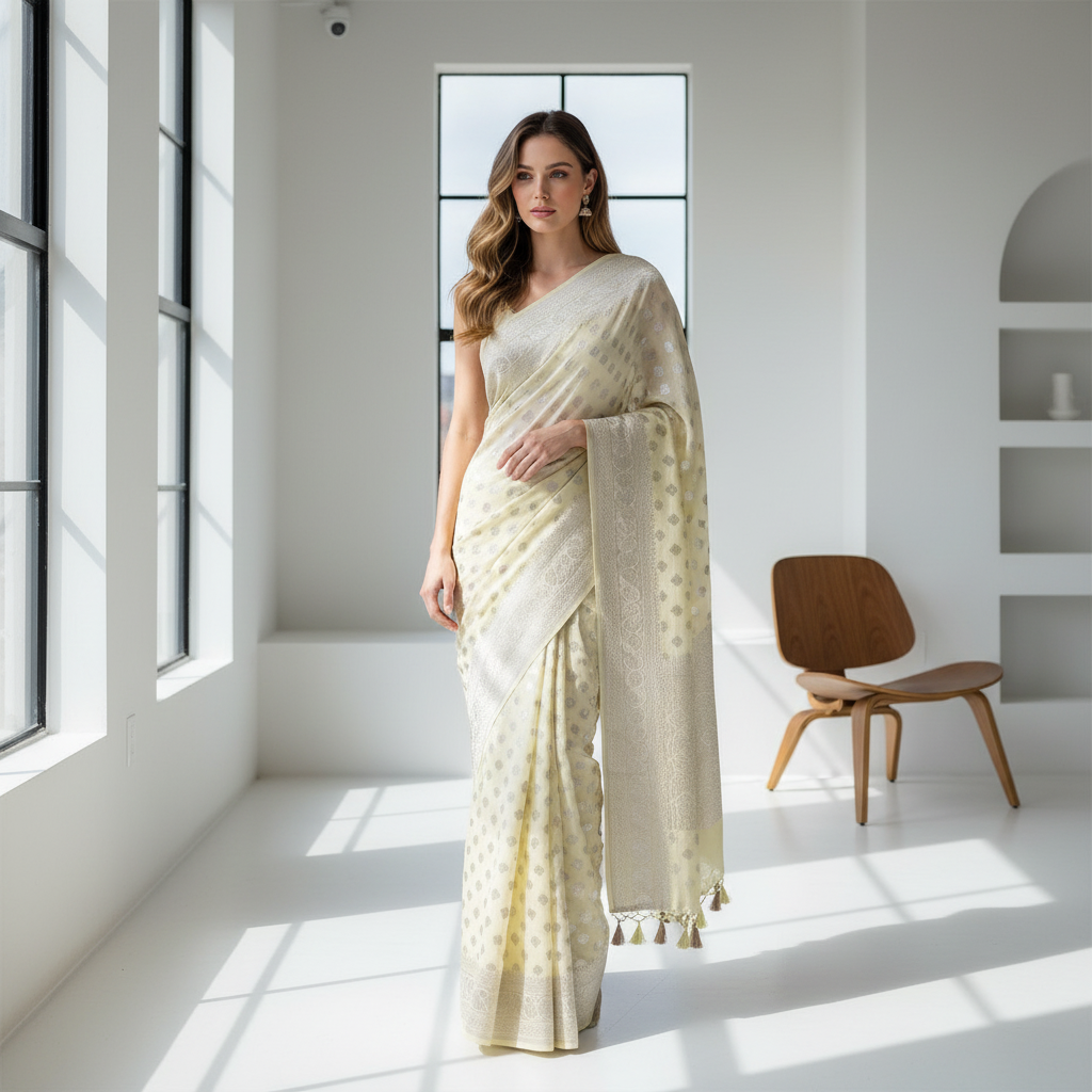 Pure georgette saree with woven butta intricate pattern all over the saree with intricate border.