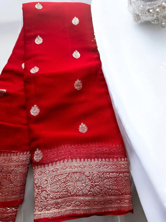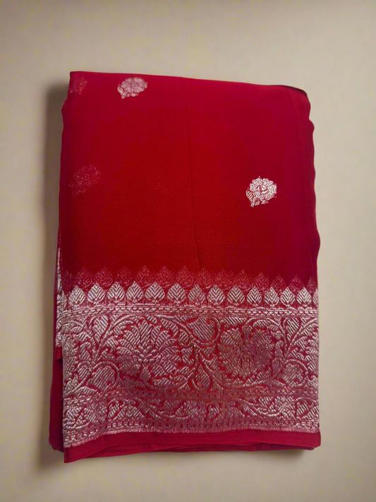 RED CHIFFON GEORGETTE WITH SILVER BUTTA SAREE