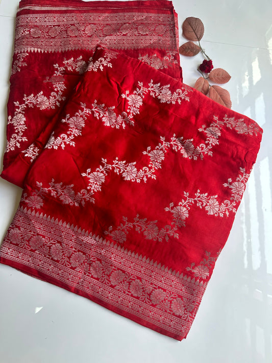 DEEP RED CHIFFON GEORGETTE WITH SILVER BUTTA SAREE
