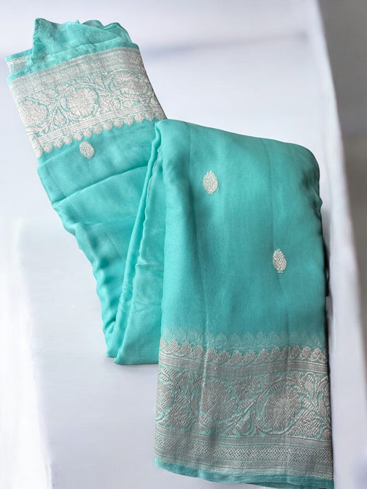 SEA BLUE CHIFFON GEORGETTE WITH SILVER BUTTA SAREE